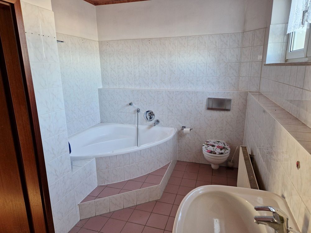 Das Badezimmer verfügt über ein Fenster sowie einer schönen Eckbadewanne.
